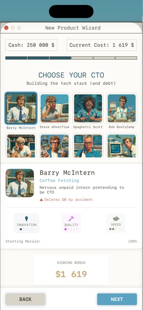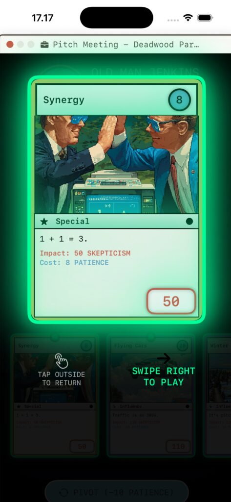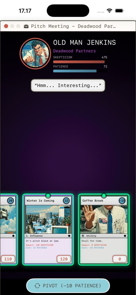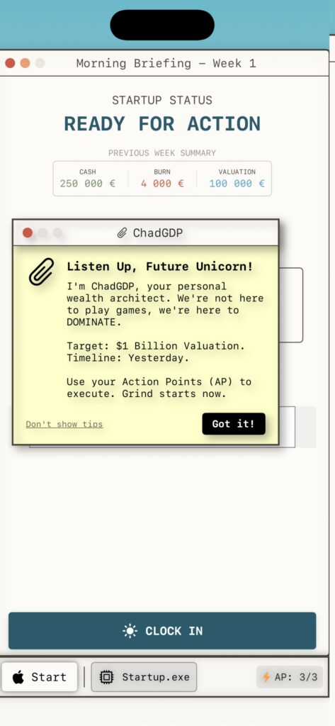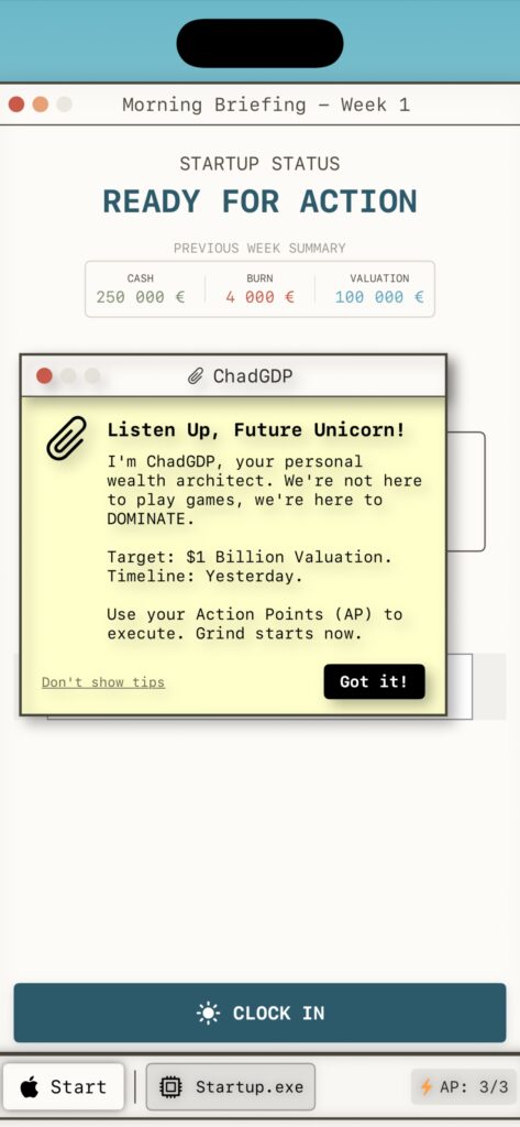 | Immerse yourself in a fully functional 90s desktop environment complete with a Start Menu, a trash can, and an ever-watching “ChadGDP” assistant | Face off against VCs like “The Shark” or “The Dinosaur” in strategic card battles. Use your team to play Strategy, Vision, and Buzzword cards to break down investor skepticism – Ready for funding? | Pivot your product to match shifting weekly trends. Ride the wave of AI/ML Hype, VR Dreams, Blockchain Magic, or Fintech Scams to boost your revenue | Manage your team’s morale carefully. If you push them too hard with “Crunch Time” or resort to layoffs, expect brutal roasts and insider rumors on your dashboard’s Twitter-like social fee |