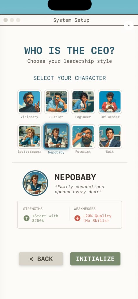 Take on the role of CEO in a chaotic, satirical startup environment. Start in a dingy Garage and hustle your way to a massive Tech Campus. You’ll need to develop hype-driven products, hire eccentric tech talent, and manage your action points every week before your cash burn rate hits -$50,000. Choose your CEO archetype—are you the visionary, the suit, or the influencer?—and lead your company to unicorn status